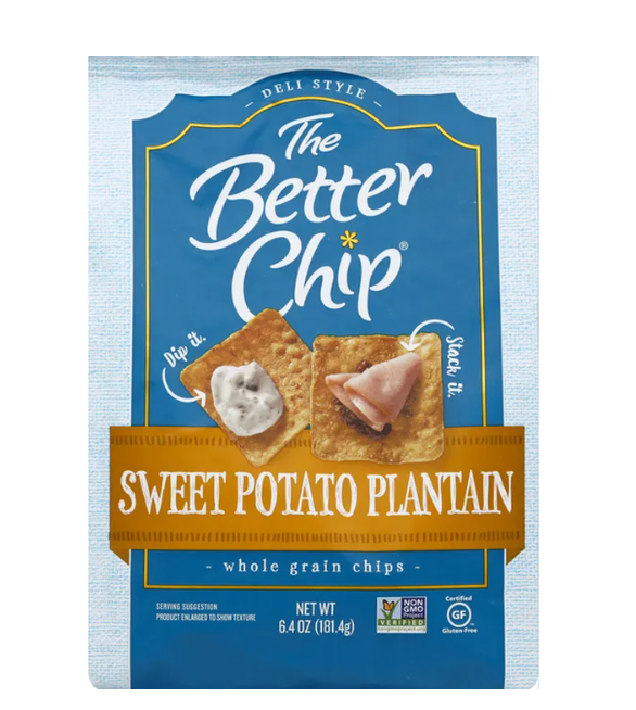 Deli style. Dip it. Stack it. Non GMO Project verified. www.nongmoproject.org. Certified gluten-free. Dips like a chip stacks like a cracker. Made for better pairing & sharing. Be bold with your snacks. Each whole grain chip is packed with a delicious combination of sweet potato, farm-fresh plantains, and accented with cinnamon for maximum flavor. These simple ingredients make the perfect chip for pairing with dips, meat, cheese other crowd favorites. Dip it or stack it, these chips make snacking fun and entertaining easy. Made with sweet potatoes, plantains, cinnamon.