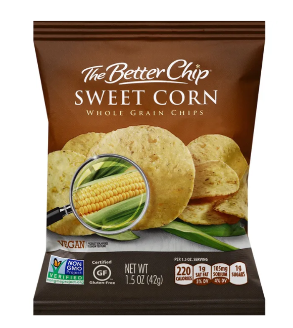 Per 1.5 oz Serving: 220 calories; 1 g sat fat (5% DV); 105 mg sodium (4% DV); 1 g sugars. Vegan. Certified gluten-free. Non GMO Project verified. nongmoproject.org. Simple Ingredients: Real flavor from simple ingredients you can see and taste. No flavor dust or taste bud trickery here. Farm fresh sweet corn right off the cob cooked into each whole grain chip for real flavor from simple ingredients. Verified non-GMO. Whole grain. Grab & go then slow down and enjoy! These sweet corn chips are also great with black bean salsa or fresh pico de gallo. Look for us in your supermarket near the fresh dips. Facebook. Twitter. Pinterest. www.thebetterchip.com. Product of Mexico.